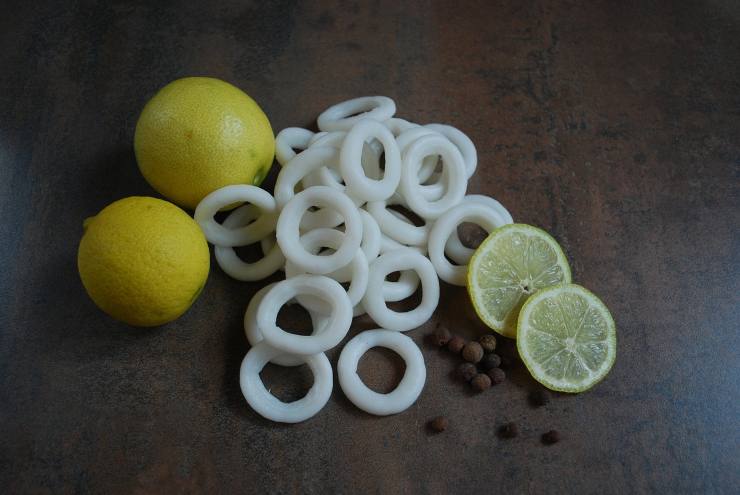Pulisci i calamari, eliminando le sacche dai tentacoli e svuotando gli interni, compresa la spina. Lavali, tamponali con carta assorbente e tagliali a formare gli anelli.
