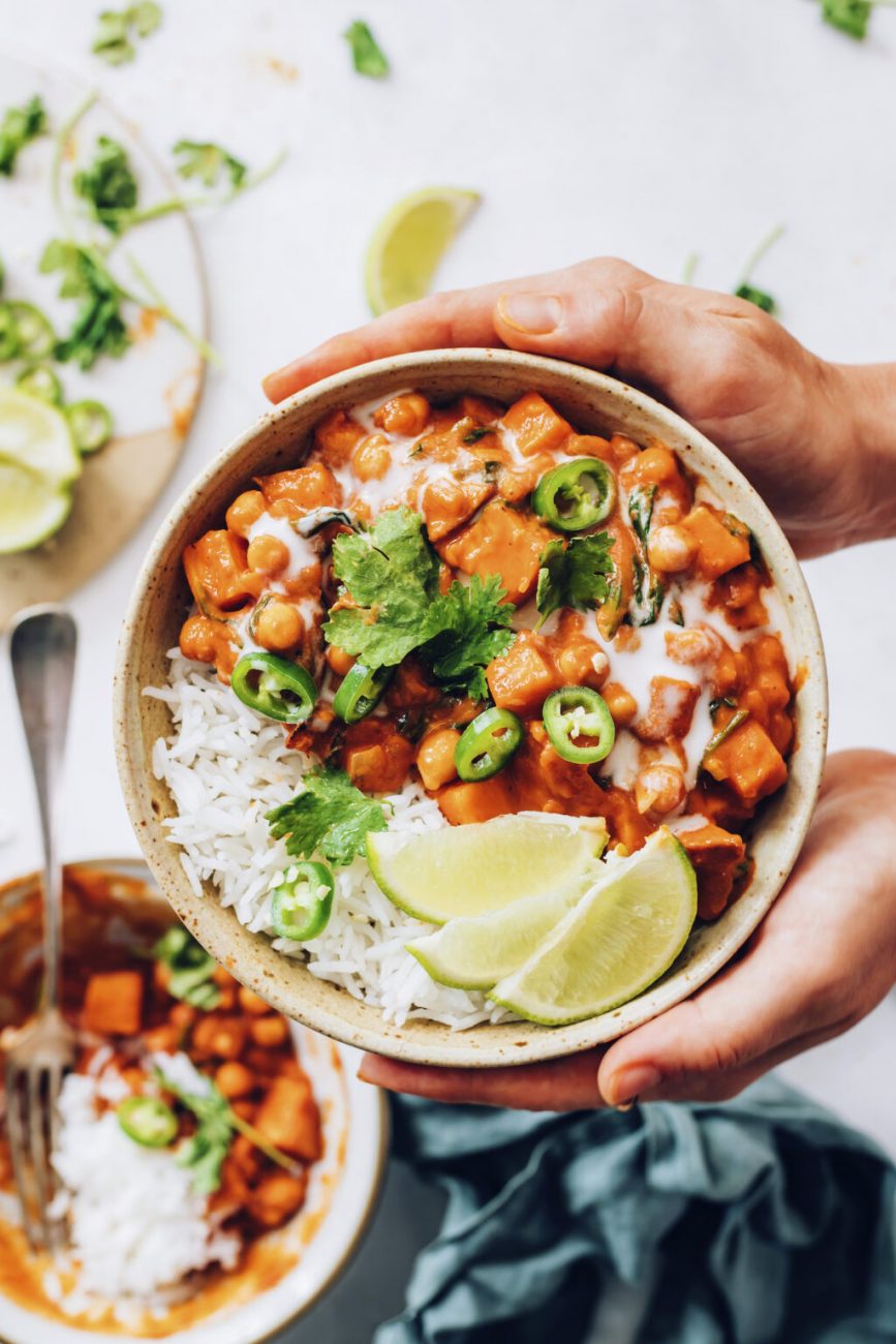 Ci piace servirlo con riso al cocco, riso integrale o riso bianco e guarnire con guarnizioni di coriandolo, lime e jalapeño. Si abbina benissimo anche con il nostro Naan vegano facile o Naan soffice senza glutine (Senza lievito, 20 minuti!).