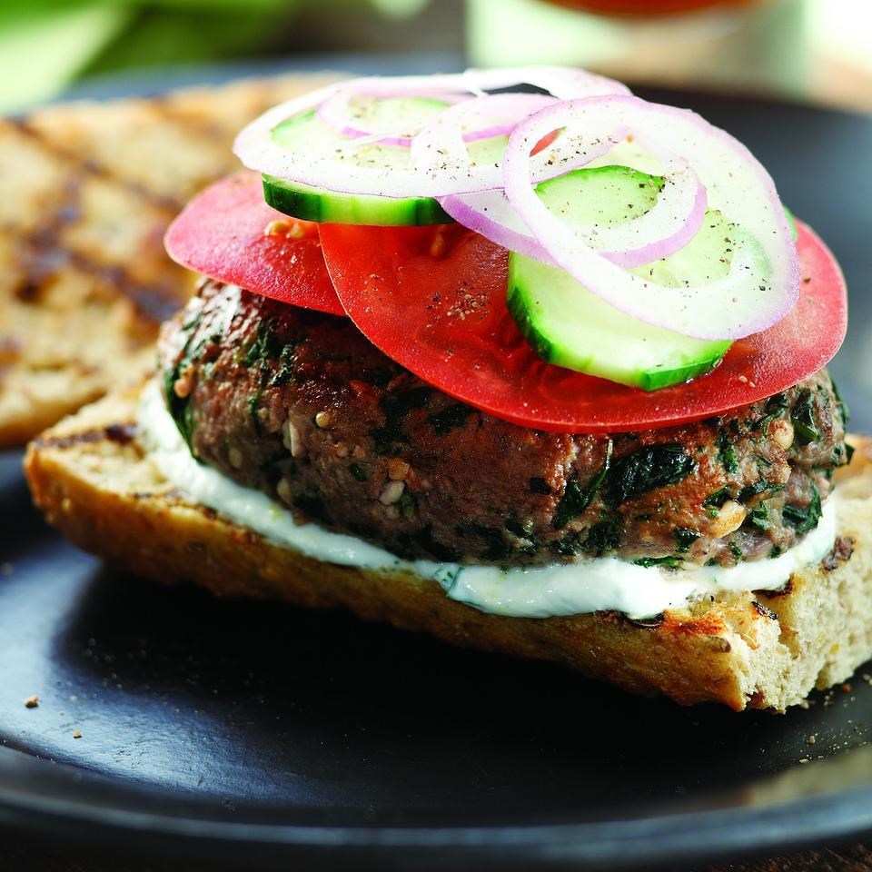Start by adding all of the ingredients to a large mixing bowl and stir to combine. Form into a 4 large burgers. Preheat a large skillet over medium heat with the olive oil and cook the burgers for 5-6 minutes on each side or until cooked through. Serve with lettuce leaves for the bun. Serving suggestion serve with greek yogurt as a sauce, if desired.