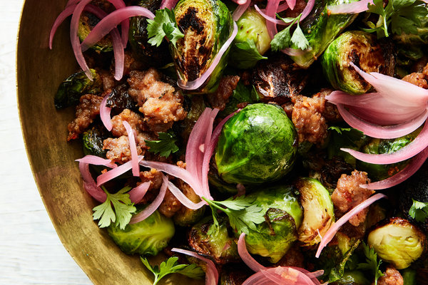 Preheat oven to 400 degrees F. Cut off the ends of the Brussels sprouts, pull off any discolored outer leaves, then cut in half. Mix the sprouts in a bowl with the olive oil, salt, pepper, and red pepper flakes. Add the sprouts to a baking sheet pan lined with foil. Spread the sausage meat around and on top of the sprouts. Roast for 15 minutes, then stir and turn the sprouts over. Cook another 10 minutes, then add the garlic and stir. Continue to cook, until crisp and golden on the outside and tender on the inside, about another 10 minutes. Serve warm.