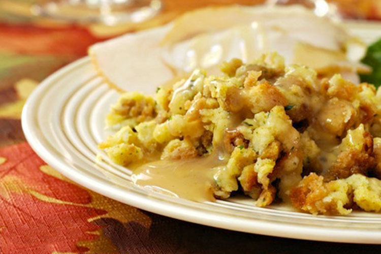 Crumble the cornbread and the day old bread. Spray your slow cooker with non stick spray. Add all of the ingredients except the butter, salt and pepper to your slow cooker and stir together. Dot the butter over the dressing and season with salt and pepper. Cover and cook on high for 2 hours or on low for 4 hours.