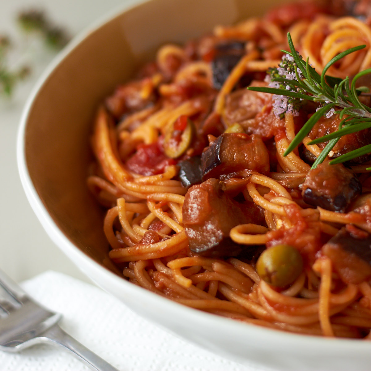 Cook the spaghetti by following the instructions on the package. Drain it. Season the eggplant dices with some salt. Let them sit for 18 minutes. Discard the excess water and dry them. Place a pan over medium heat. Heat in it a splash of oil. Cook in it the eggplant dices until they become golden brown. Drain and place them aside. Stir in the garlic with chili flakes. Cook them for 45 seconds. Stir in the olives, capers, tomatoes, puree and dried seasoning. Put on the lid and let them cook for 32 to 36 min over low heat. Stir in the cooked eggplant dices with spaghetti and basil leaves. Adjust the seasoning of your spaghetti then serve it warm with some grated Parmesan cheese. Get a mixing bowl.