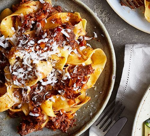 Another indispensable recipes. Although it takes some time to cook this sauce, the actual preparation is very tasty. The best result is achieved by using a piece of pork and a piece of lamb, both on the bone, but any combination, or all of one meat, will do. The result is a deliciously condensed sauce which we would eat with our pasta, to be followed by the meat as a main course. If you want the meat to serve 4 as a main course, increase it to 1 kg (2 1/2 lb) all told.