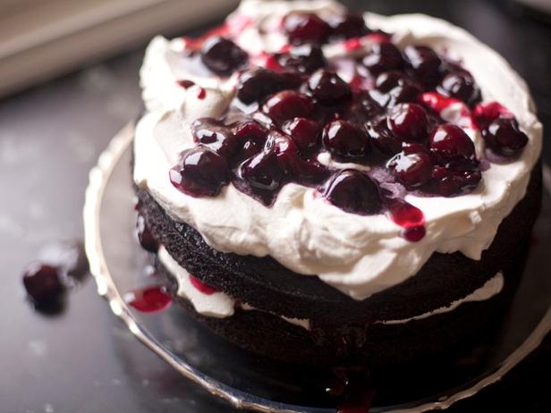 Precalentar el horno a 180°C (moderado). Enmarcar y enharinar una tortera mediana. Reservar. Batir la mantequilla con el azúcar hasta lograr una crema bien suave y esponjosa. Derretir el chocolate a bano maria, y luego mezclarlo con las almendras molidas. Incorporar a la mantequilla batida. Separar las claras a nieve en un bol aparte, e incorporar a la mezcla en forma envolvente. Verter en la tortera y llevar al horno por 30 minutos. Dejar enfriar. Lavar las cerezas, y cortarlas al medio, descartando el carozo. Derretir el chocolate y verter sobre las cerezas. Dejar que se asiente. Mientras tanto, en un bol batir la nata a punto chantilly. Hacer un hueco en el centro de la torta y rellenar con la nata y las cerezas de chocolate. Cubrir con la nata batida y luego espolvorear con el resto de los grumos de la torta que retiraste del centro.