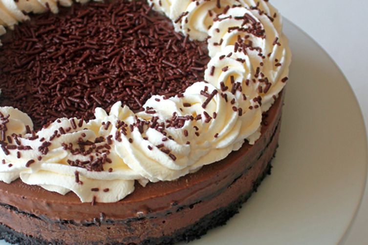 Enmantecar y espolvorear con nueces picadas una tortera desmontable. En un bol, batir la nata con el azúcar glas a puno Chantilly. Reservar en la heladera. En un bol a bano Maria, derretir el chocolate con el coñac. En otro bol, batir 200 gr de mantequilla con 200 gr de azúcar hasta lograr una crema. Agregar los huevos y batir entre cada uno. Incorporar el chocolate derretido y mezclar. Volcar la mitad de esta preparación de chocolate en el molde preparado. Rellenar encima con 1/3 de la crema Chantilly y finalizar con el resto de crema de chocolate. Llevar a la heladera y dejar enfriar 2 horas. Una vez frío, desmoldar sobre la base de bizcochuelo. Decorara los bordes con crema Chantilly y pegar las lenguas de gato o vainilla (bizcochos de soletilla). Colocar guindas glasé por arriba.