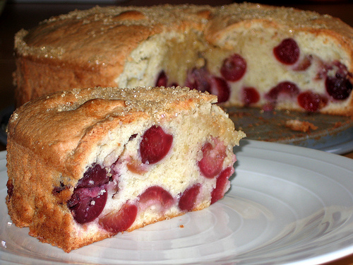Batir la mantequilla con el azúcar, esencia de vainilla y huevos hasta lograr una mezcla bien suave y cremosa. Anadir la harina, mezclada con el polvo para hornear, en forma gradual. Por último, agregar el pan rallado. Precalentar el horno a 180°C (moderado). Enmantecar una tortera desmontable. Verter la preparación en el molde. Desparramar las cerezas por arriba en forma uniforme, presionando levemente. Llevar al horno por 1 hora. Espolvorear con azúcar glas antes de servir.