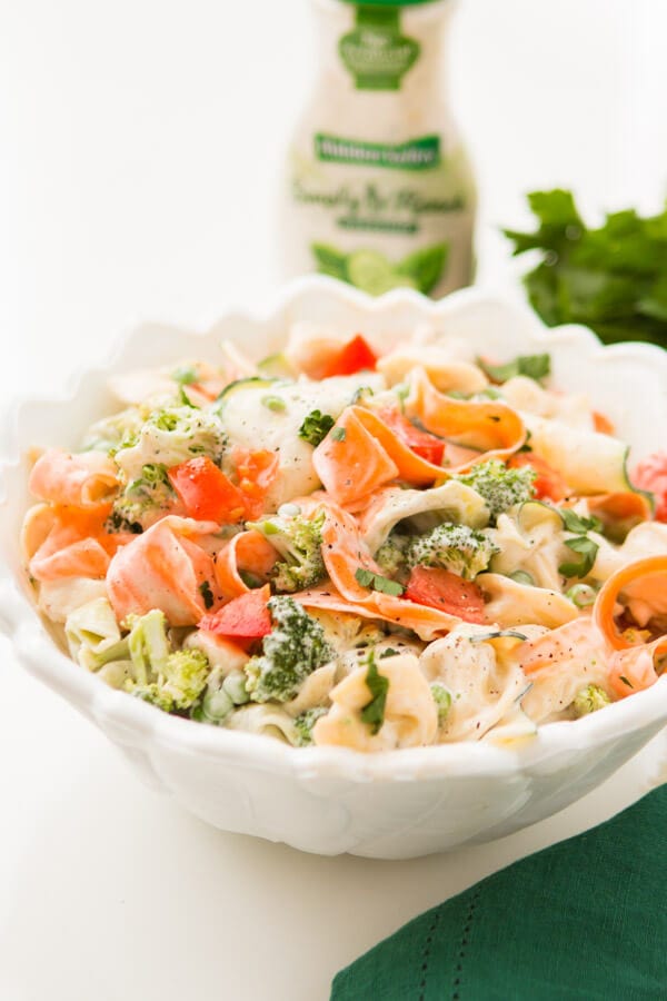 Usa un pelapatate per fare nastri di verdure per questa ricetta di insalata di tortellini ranch di 10 minuti che è un contorno facile e veloce per i barbecue!