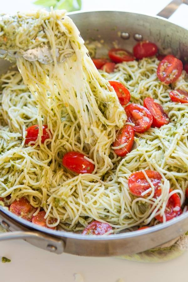 Se hai bisogno di ricette vegetariane o senza glutine, questa pasta al pesto di basilico è un’ottima opzione per la cena. Puoi aggiungere il pollo per renderlo un piatto più sostanzioso, ma in realtà è davvero fantastico con solo pomodorini. Diamine, potresti anche buttare dentro le zucchine tritate, che sarebbero anche buonissime. In effetti, penso che lo farò la prossima volta.