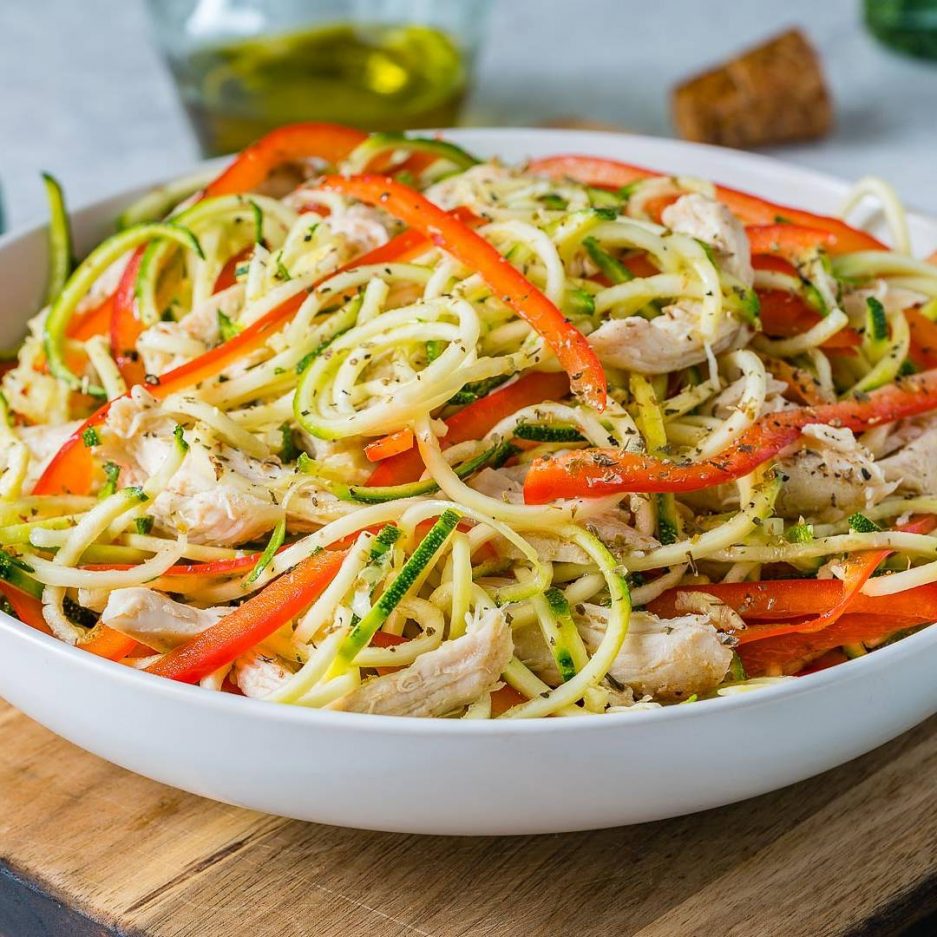 - In una piccola ciotola, mescola tutti gli ingredienti per la salsa, mentre in una ciotola più grande dovresti aggiungere le tagliatelle di zucchine crude, il pollo arrosto e i peperoni rossi. Per finire, condisci con un po’ di vinaigrette al balsamico e mescola delicatamente tutti gli alimenti prima di servire.