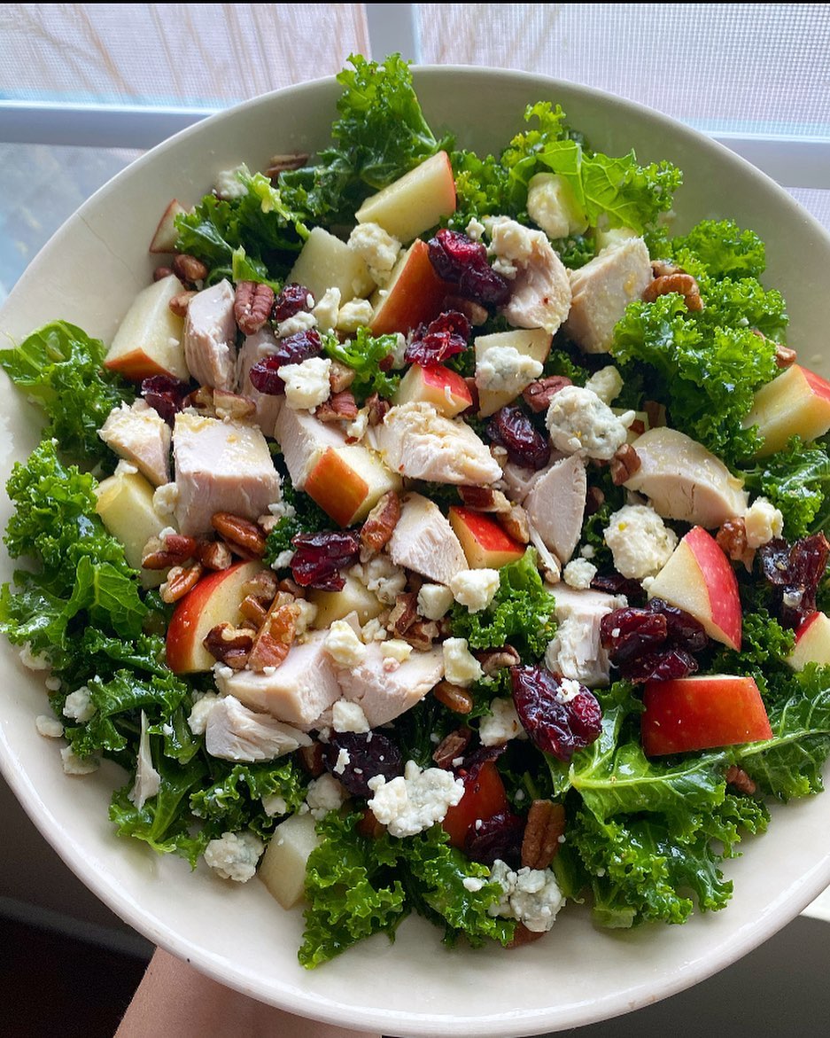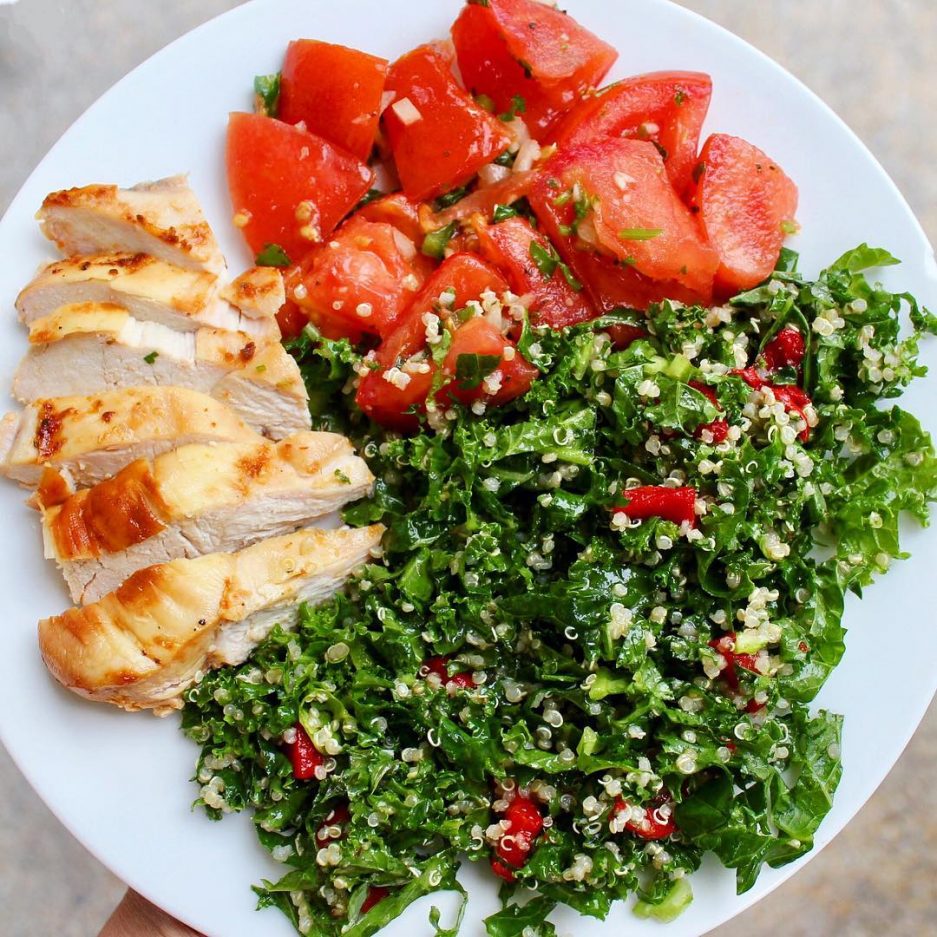 - Questa idea di piatto salutare è composta da pollo alla griglia, pomodoro a cubetti e una buona porzione di cavolo riccio, ma condito con un po’ di succo di limone, olio extravergine di oliva, quinoa e peperoncino.