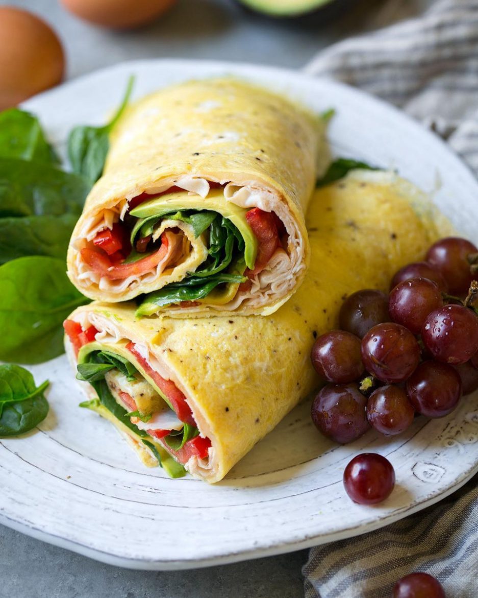- Cospargere di formaggio e lasciare per un minuto. Togliere dal fuoco e guarnire con tacchino, pomodoro, avocado e spinaci. Infine, arrotolare l’uovo, tagliarlo a metà e servire da gustare subito.
