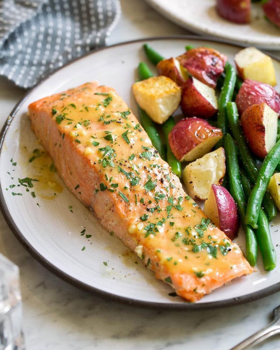 - Preriscaldate il forno a 400 gradi (204°C) e irrorate una teglia con lo spray da cucina, mentre in una ciotolina dovreste mescolare il burro fuso, la senape, il miele e l’aglio. Condire le bistecche con sale e pepe, quindi trasferirle nella teglia. Spalmare il pesce con il composto di burro, aggiungere un po’ di sale e pepe, cuocere in forno per 10-13 minuti. Quindi cospargete di prezzemolo e servite in compagnia delle verdure arrostite che più vi piacciono, come si può vedere nell’immagine.