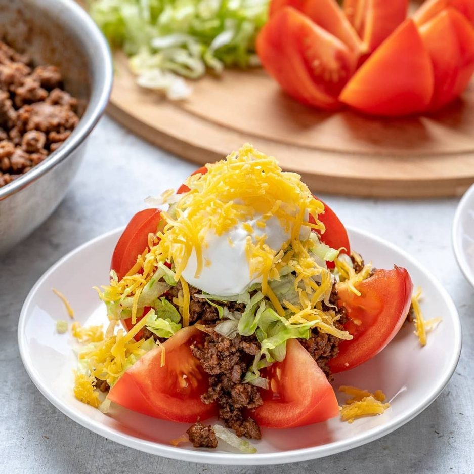 - Adagiate i pomodori su un tagliere con il gambo rivolto verso il basso e cominciate a tagliarli in 6 spicchi, in modo che siano ancora attaccati al gambo. Riempire con carne, lattuga sminuzzata, yogurt e formaggio, come mostrato.