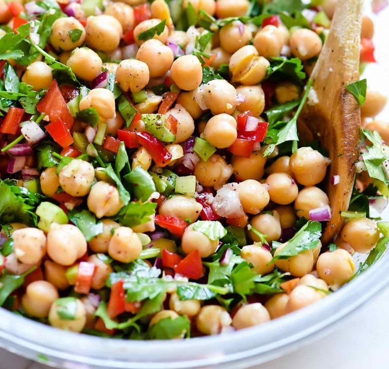 In un recipiente aggiungete la lattuga precedentemente disinfettata con aceto e acqua, poi tagliatela a pezzi medi con pomodoro a julienne senza semi, cipolla rossa, ceci saltati. Aggiungere il coriandolo tritato finemente, il succo di limone per guarnire, mescolare ancora. Impiattare e guarnire con un po’ di frutta e coriandolo.