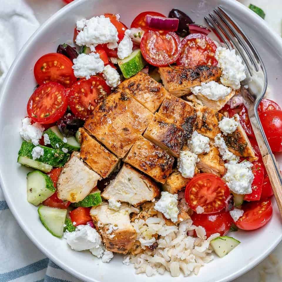 - Scaldare la padella con l’olio a fuoco medio, quindi aggiungere il pollo a cuocere circa 4 minuti per lato, lasciare riposare e affettare. Unire i pomodori, il cetriolo, le olive, la cipolla e il formaggio feta, quindi condire con il condimento rimasto, mescolare con cura e servire con il pollo.