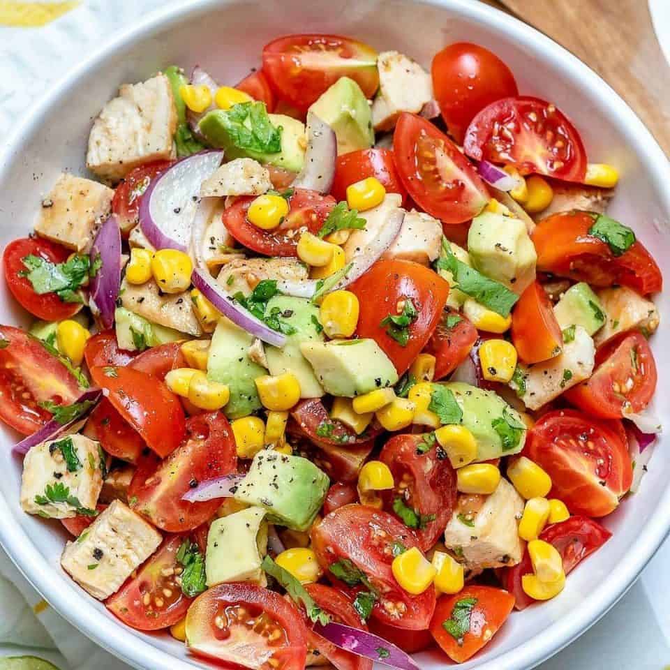- Per 4 porzioni. Sciogliere il burro in una padella a fuoco medio-alto, aggiungere il pollo e condire con sale e pepe, lasciando cuocere per circa 4 minuti per lato, poi farlo riposare e tagliare a cubetti. Mescolare il pollo con il pomodoro, l’avocado, la cipolla, il coriandolo e il mais. Infine spremere il succo di limone, condire con olio d’oliva, mescolare e condire a piacere.