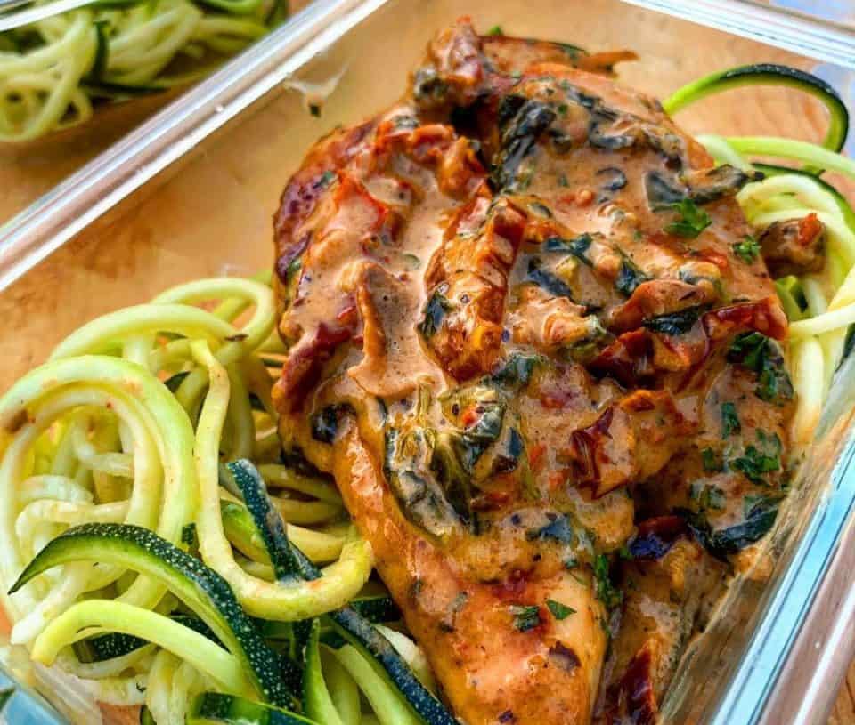 - Lasciare 1 o 2 minuti affinché i sapori si sprigionino, ridurre il fuoco e aggiungere la panna e il brodo, lasciando bollire per altri 1 o 2 minuti. Rimettete il pollo sulla padella e guarnite con il prezzemolo. Dividere il pollo in contenitori in compagnia delle tagliatelle di zucchine.