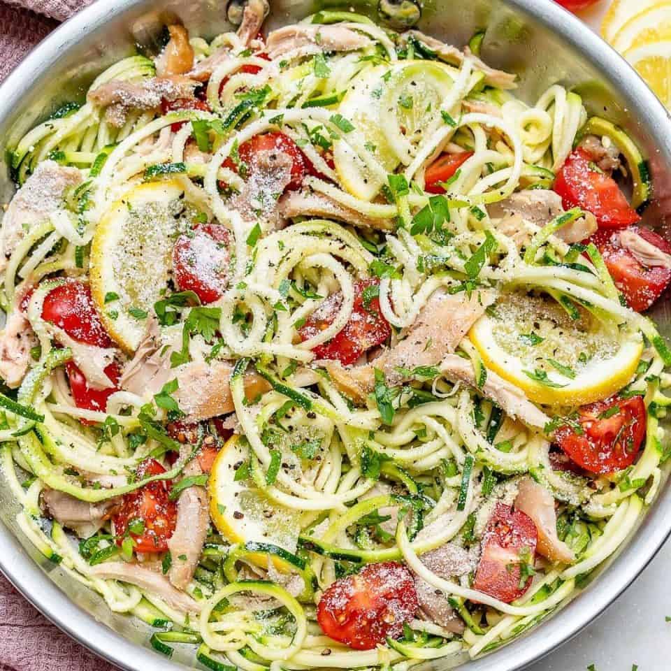- Aggiungere l’olio rimanente nella stessa padella, quindi aggiungere l’aglio, cuocere finché non diventa fragrante e mescolare le tagliatelle di zucchine fino a renderle croccanti. Ora scola l’umidità e condisci a piacere, aggiungi il pollo sminuzzato, i pomodori, la scorza e il succo di limone. Per finire spolverate con coriandolo o prezzemolo, cacio e pepe.