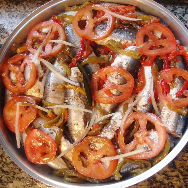 - In una pentola a pressione, formare degli strati inframezzando sarde, pomodori, cipolle e peperoni, fare questi strati fino a terminare tutti gli ingredienti. Quindi aggiungere il sale, le foglie di alloro, l’aceto e l’olio.