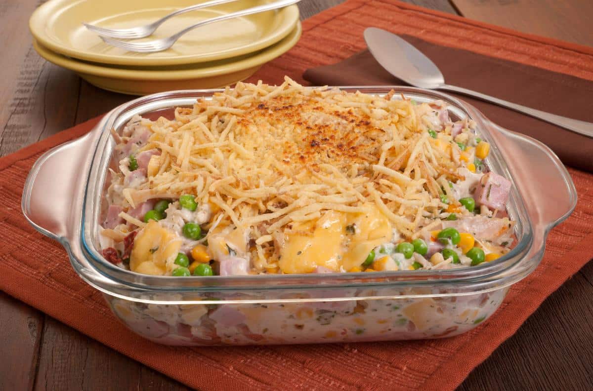 - Mescolate bene in modo che tutto il pollo sia molto umido, coprite con le patate paglia e infornate per 30 minuti (180 ºC).