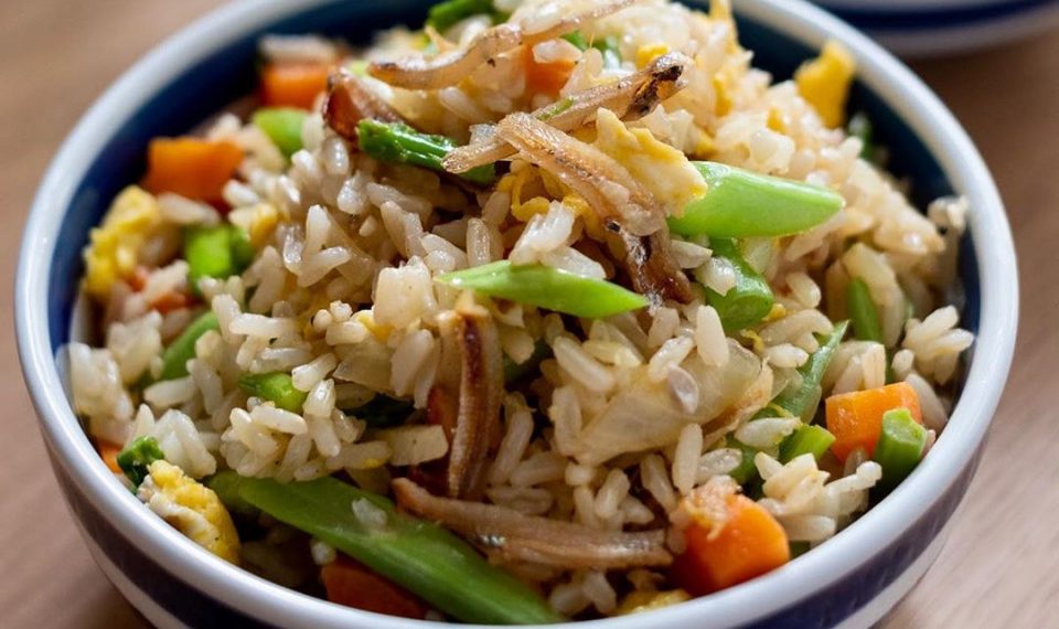 Ingredienti: 2 cucchiai di olio, 2 uova leggermente sbattute, 150 g di petto di pollo a pezzi, 2 spicchi d’aglio, 1/2 cipolla tritata, 120 g di pancetta sgrassata e tritata, 1 carota a cubetti, 1/2 tazza di mais congelato, in scatola o fresco, 1/2 tazza di piselli, 2 tazze di riso bianco cotto, 3/4 di cipolle verdi.