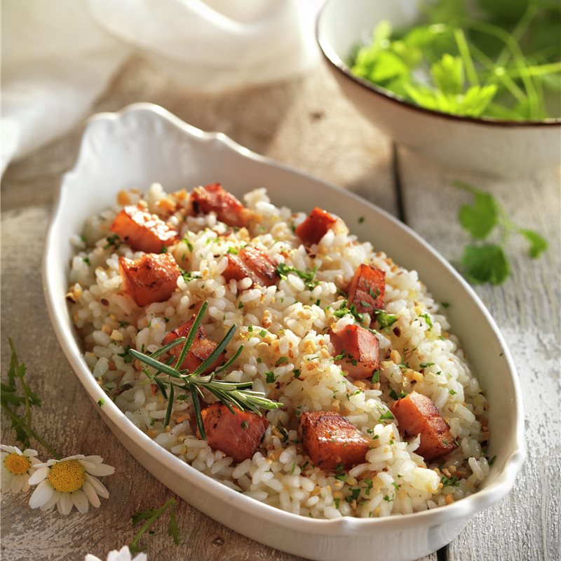 Ingredienti: 320 g di riso, 300 g di pancetta in 2 fette, 1 cipolla rossa, 3 spicchi d’aglio, 80 g di mandorle, 1 rametto di prezzemolo, 2 rametti di rosmarino, olio d’oliva e sale.