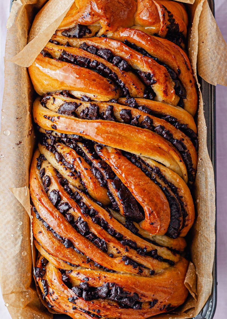 - Togli il babka dal forno e spennella tutto lo sciroppo di zucchero. Lasciare raffreddare il babka, quindi rimuovere dallo stampo da plumcake e divorare!