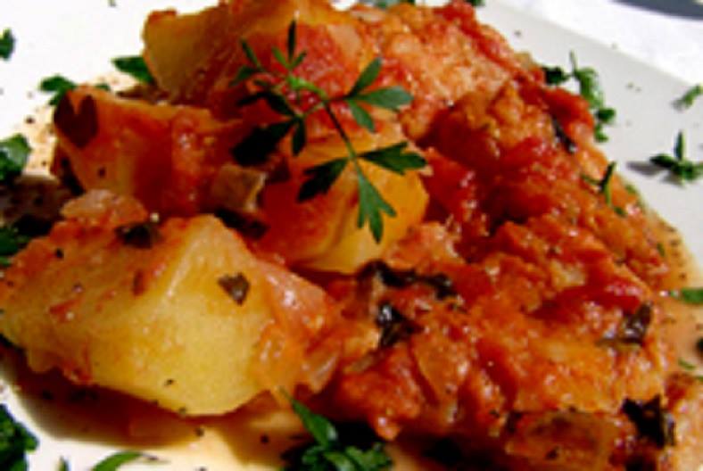 Mondare, lavare e tritare le cipolla, asciugare con uno strofinaccio bene il baccalà, preparare una teglia da forno, versare l’olio fino a coprire il fondo quindi disporre le cipolle, aggiungere il baccalà e le patate lavate e tagliate , salare il tutto aggiungendo il peperoncino piccante e il rosmarino. Infornare a 250° in forno già riscaldato per circa mezzora aggiungere i pomodori pelati, finire la cottura , girare ogni tanto ,non lasciare asciugare troppo il pomodoro, togliere dal forno e aggiungere il prezzemolo tritato e servire caldo.