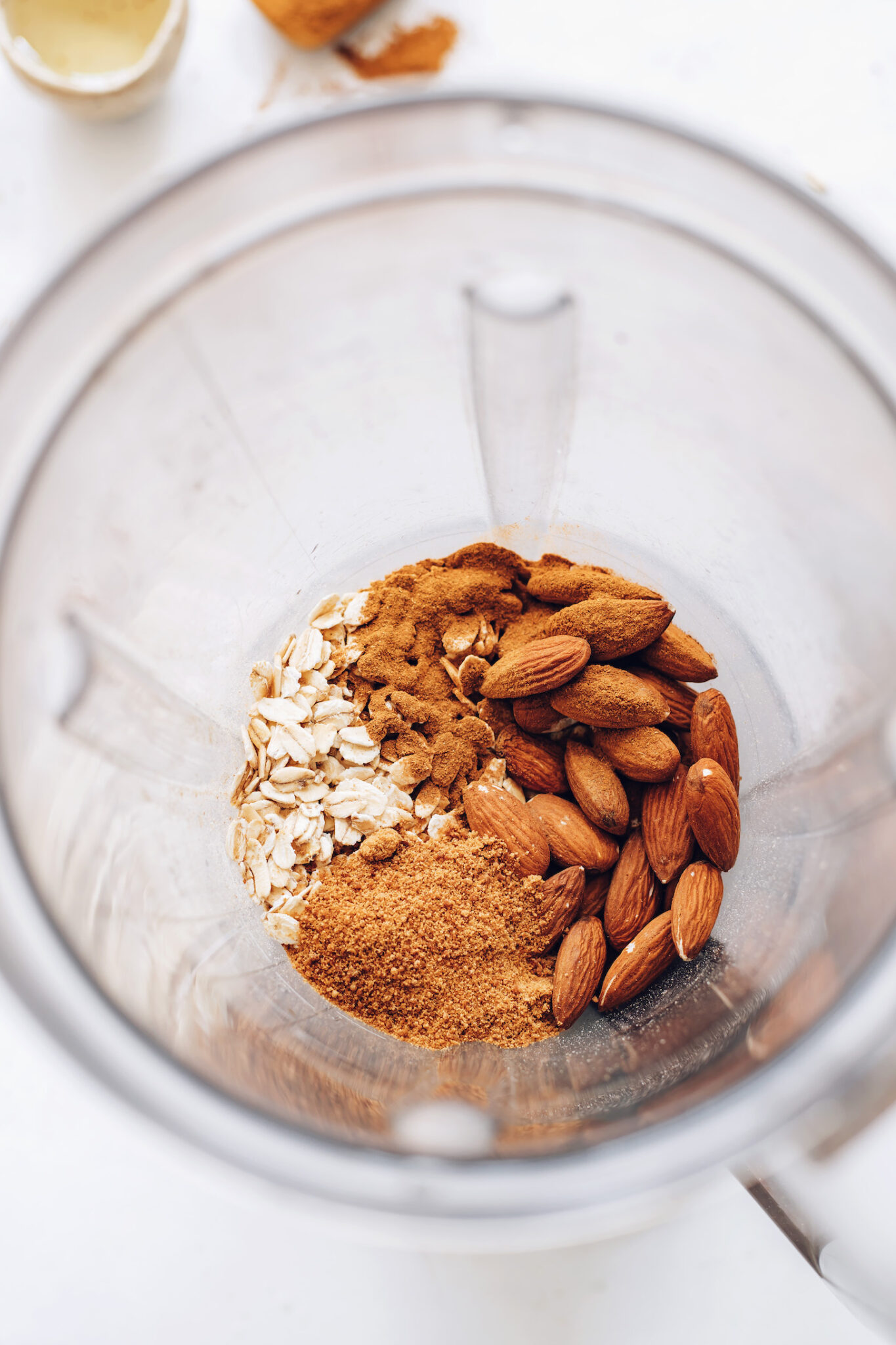 - CROSTA: Aggiungere avena, mandorle, sale, zucchero di cocco e spezie per torta di zucca in un frullatore ad alta velocità e frullare in alto fino a quando il composto non assomiglia a un pasto fine.