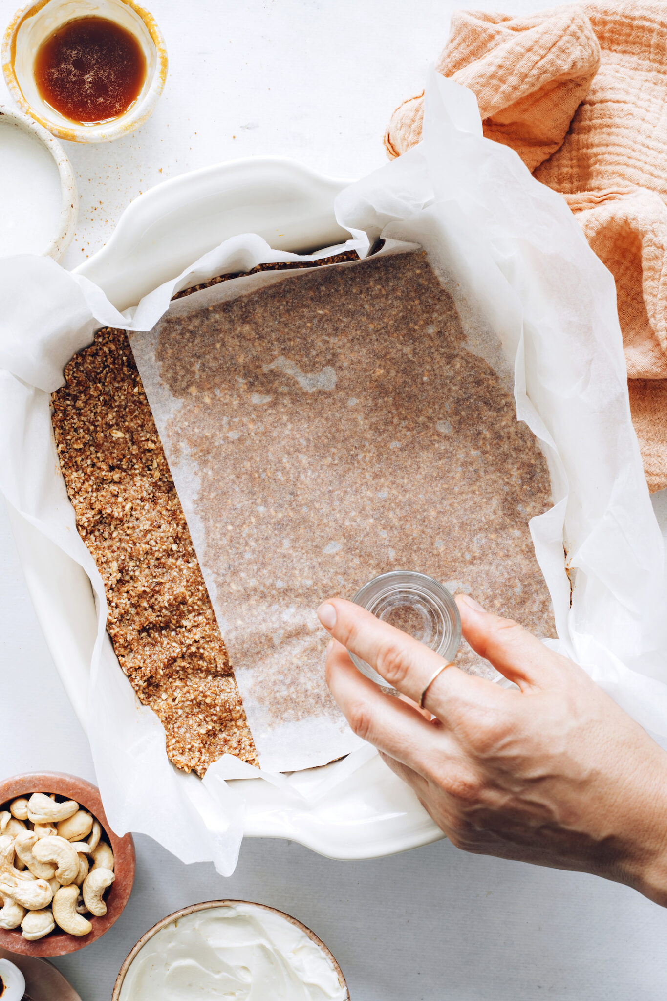 L’impasto si unisce con l’aiuto dell’olio di cocco, che assicura la consistenza perfetta per la pressatura in una padella. Il nostro trucco preferito per prevenire una crosta friabile è imballarlo usando un bicchiere su carta pergamena. Quindi è pronto per andare in forno a cuocere prima di aggiungere il ripieno!