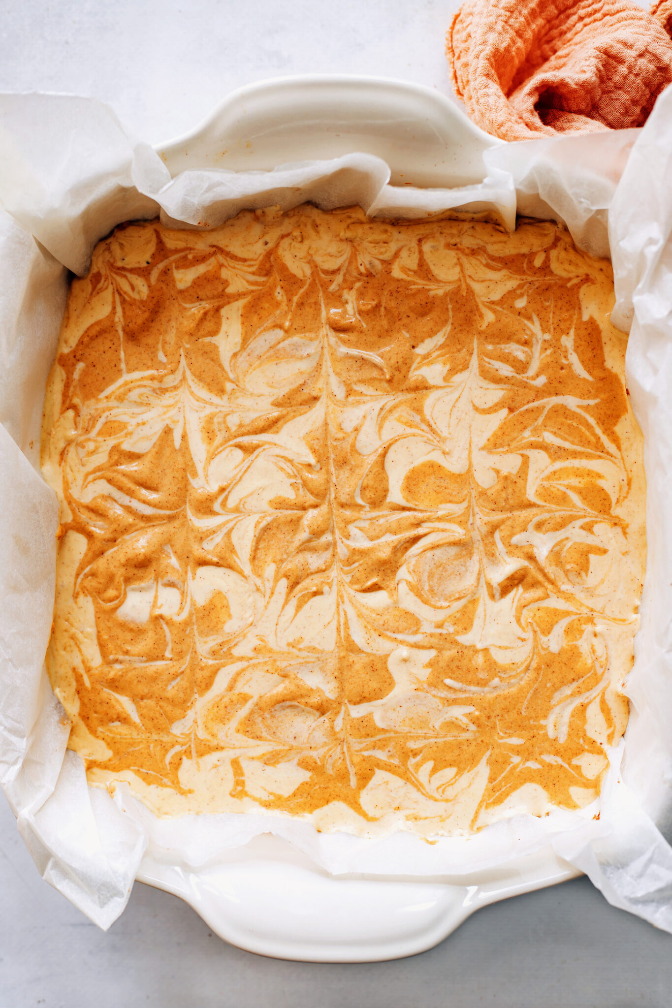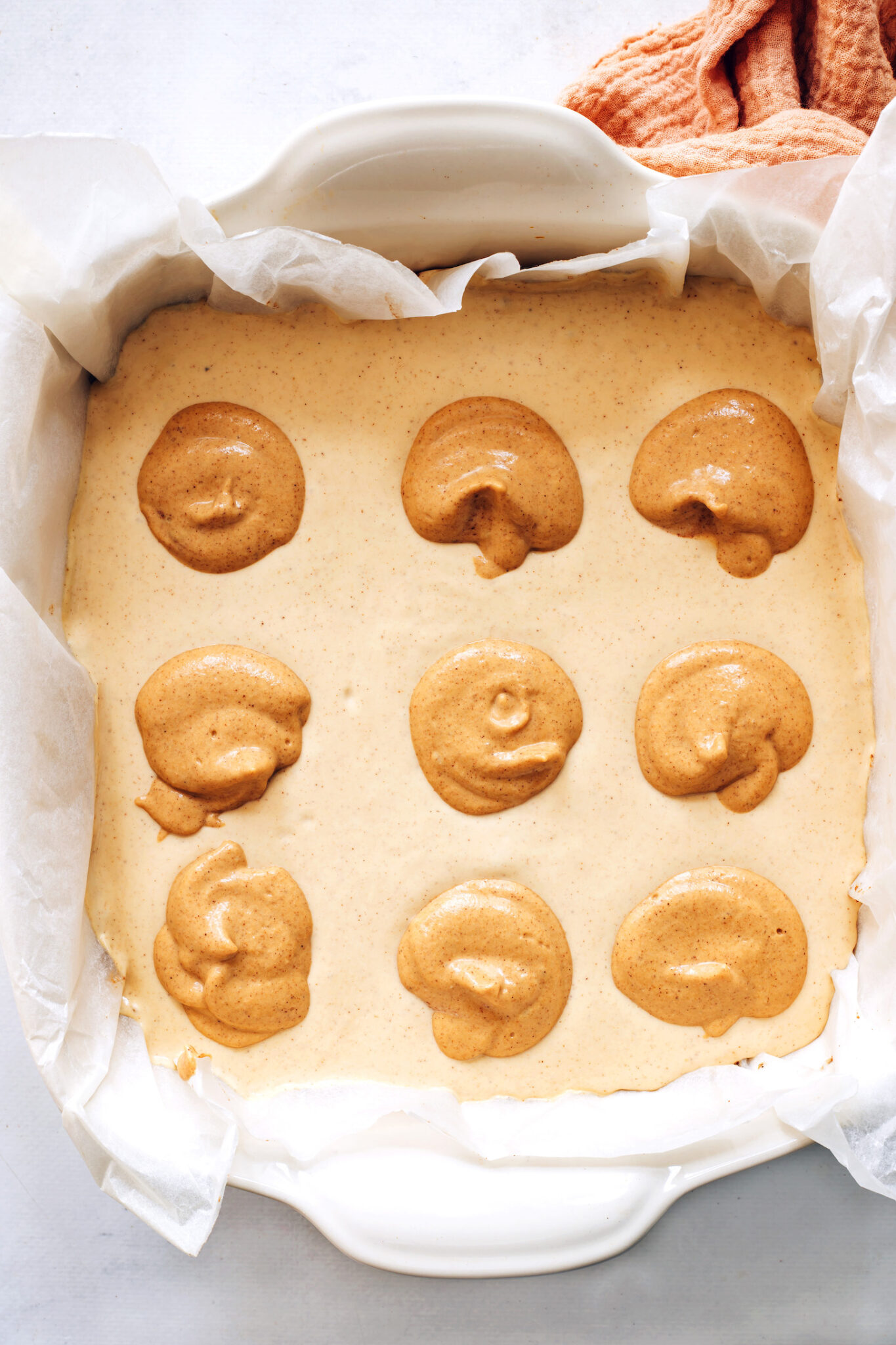 - Battere delicatamente il piatto 8×8 (20,32 cm x 20,32 cm) sul bancone alcune volte per rimuovere le bolle d’aria dallo strato di cheesecake, quindi versare circa 1/4 di tazza dell’impasto della cheesecake alla zucca più scura che hai appena miscelato sulla parte superiore del ripieno e usa il dorso di un coltello o uno stuzzicadenti per girare.