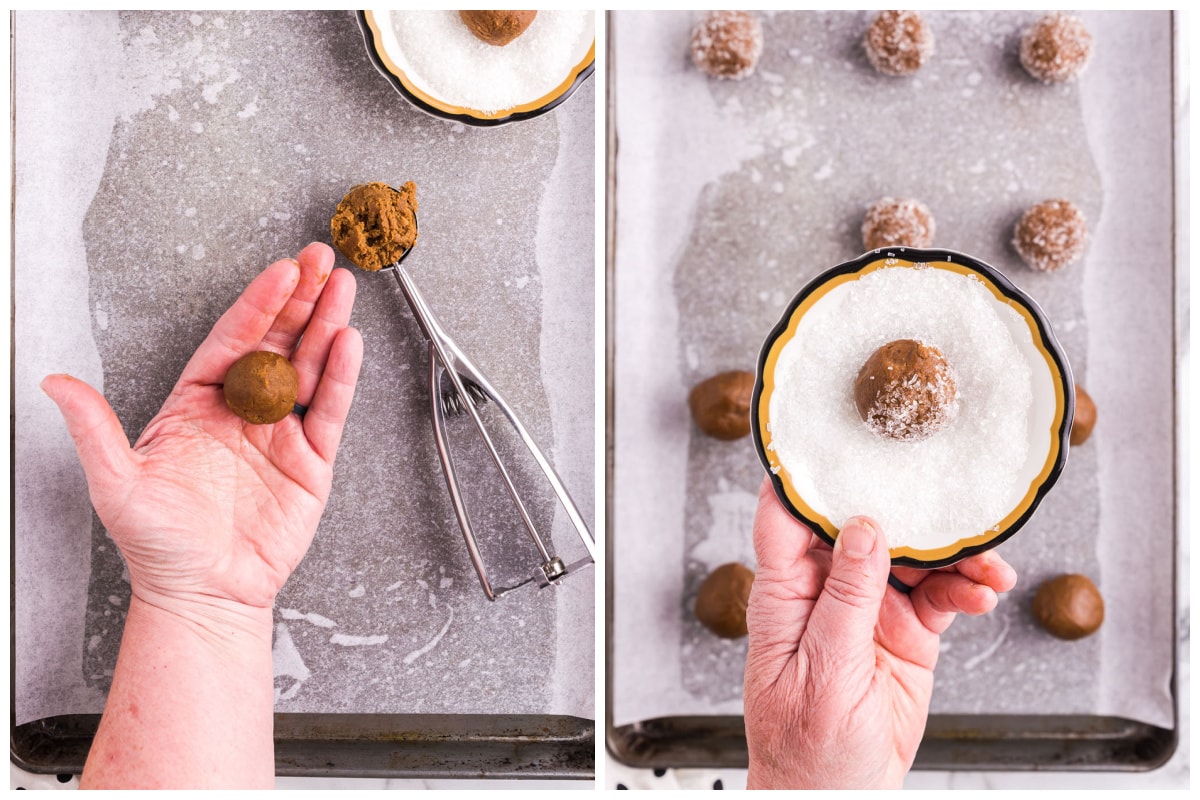 - Usando un cucchiaio per biscotti da 1 ½ cucchiaio, prelevare l’impasto dei biscotti. Arrotolare l’impasto in una palla.