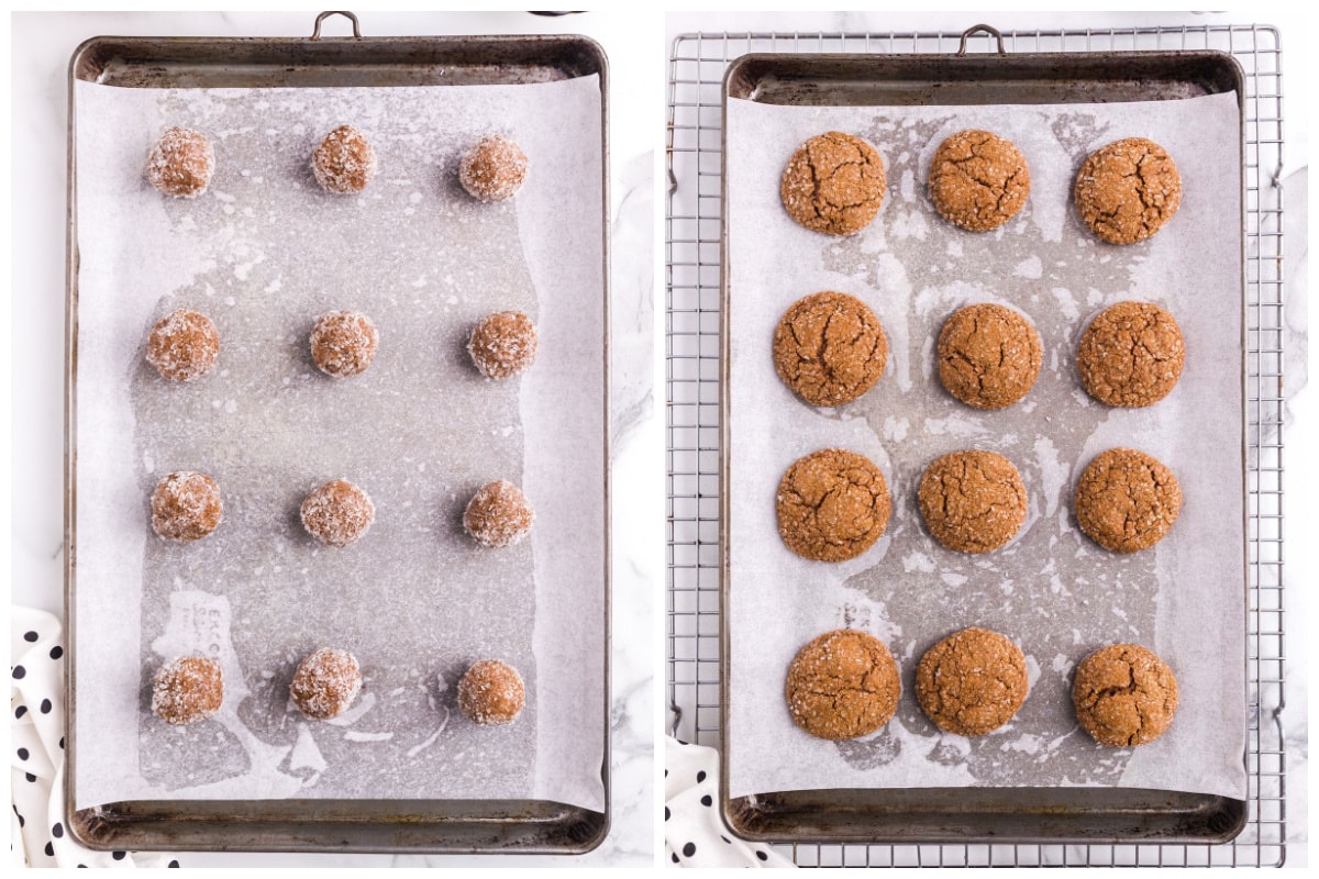 Suggerimento: assicurati di lasciare raffreddare l’impasto dei biscotti in frigorifero per almeno 30 minuti per evitare che diventi troppo appiccicoso. - Arrotolare la pasta biscotto fredda in palline, ricoprire con zucchero a velo e adagiare su una teglia foderata di pergamena.