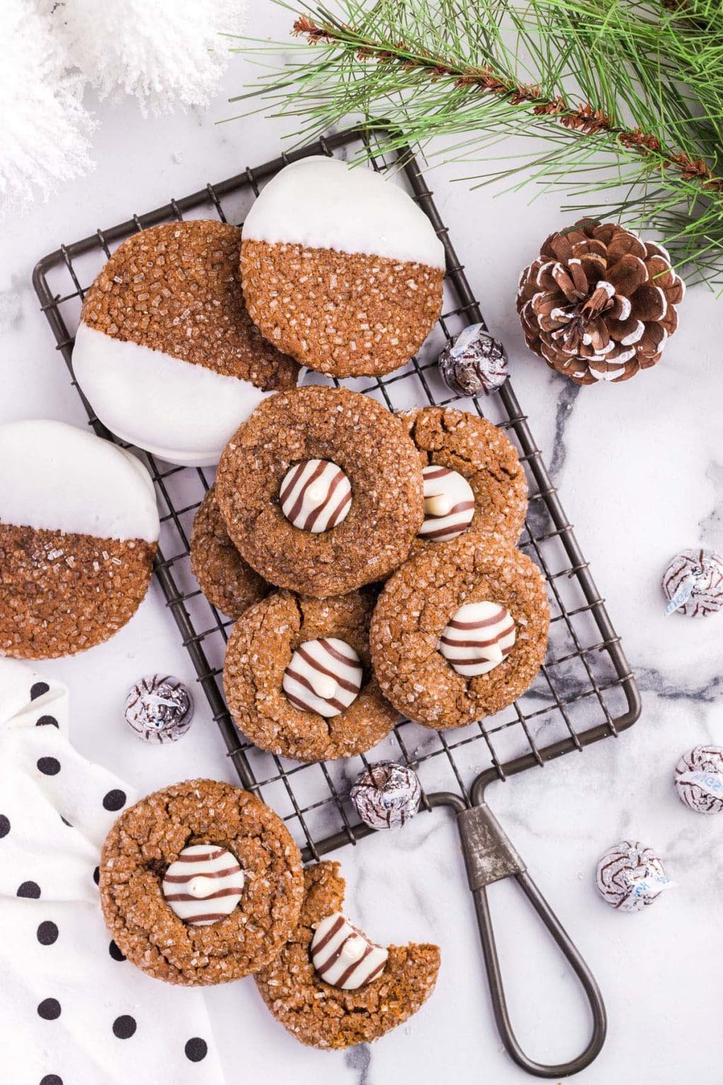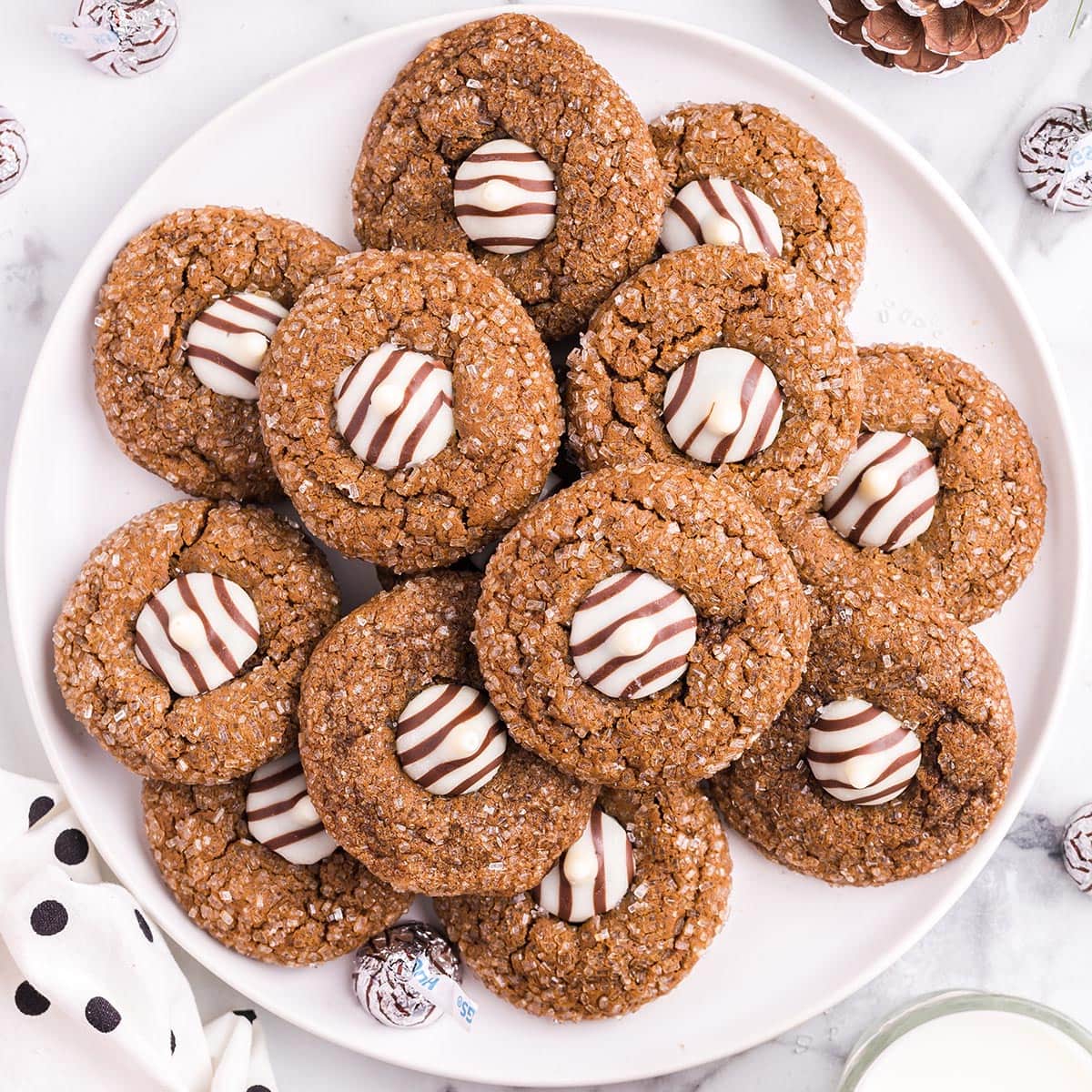 I biscotti bacio di pan di zenzero combinano le spezie natalizie con i dolci abbracci di Hershey per creare il biscotto natalizio più semplice e imperdibile. Queste deliziose prelibatezze sono veloci da cuocere e un modo divertente per diffondere un po’ di gioia.
