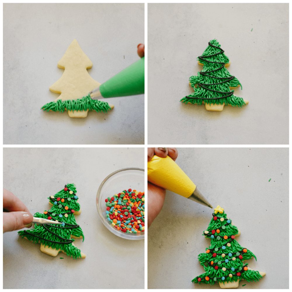 - Aghi per il gelo: usando la glassa verde pastello e una punta extra grande a forma di stella, sovrapponi delle palline per rendere l’albero soffice. Coprire l’intero biscotto.