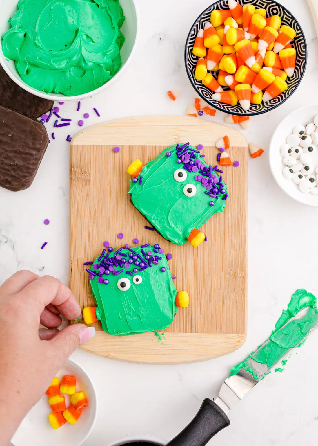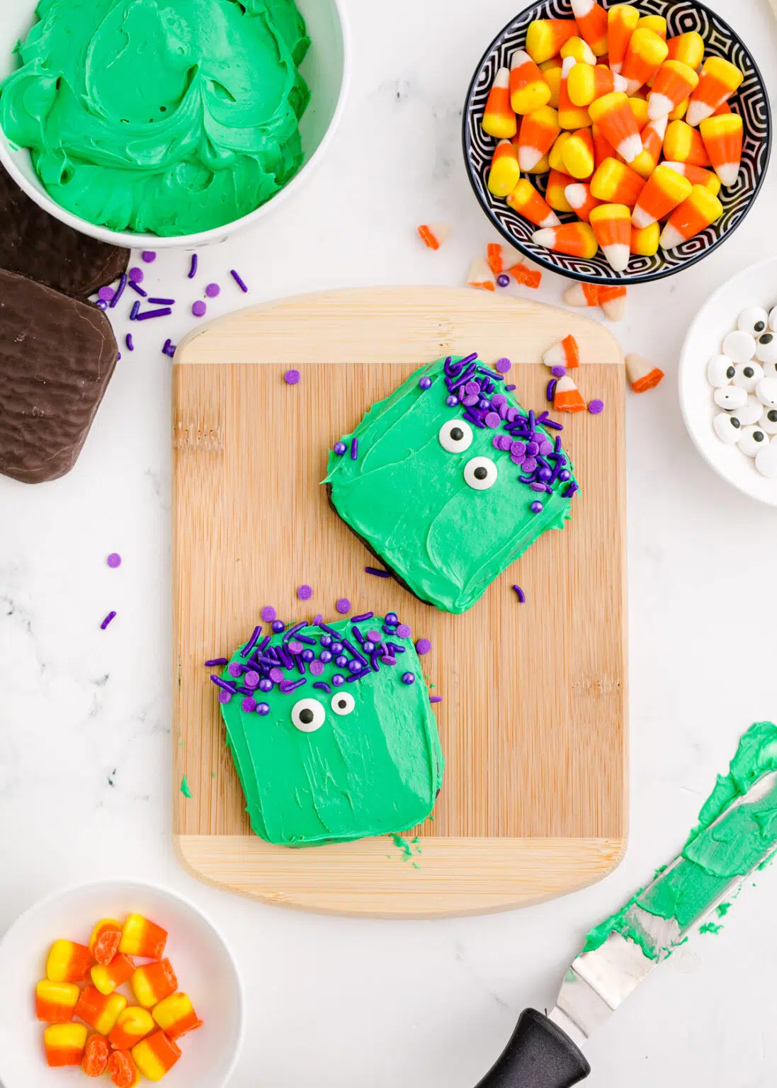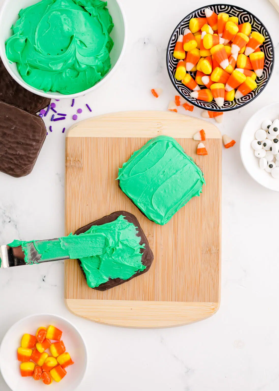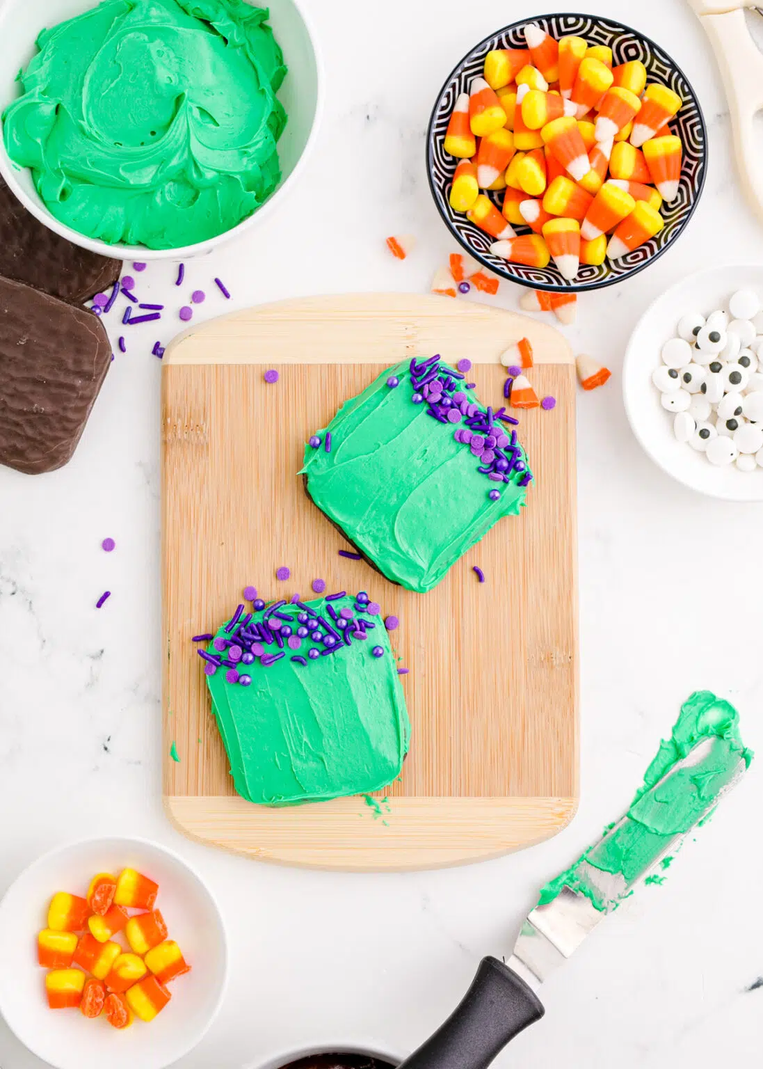 - Quindi cospargi gli zuccherini viola sul terzo superiore del biscotto per creare i capelli di Frankenstein.