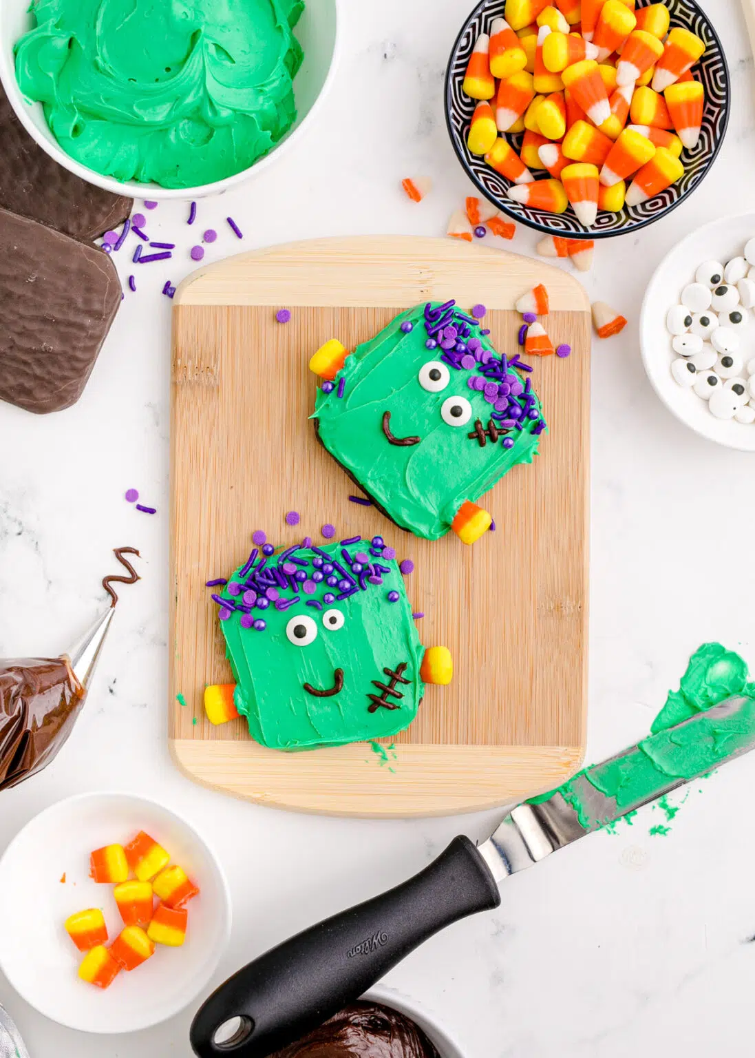 - Infine, immergi il lato tagliato di ogni mais caramellato in un po’ di glassa verde e attacca due pezzi su ciascun lato del biscotto per creare dei bulloni.