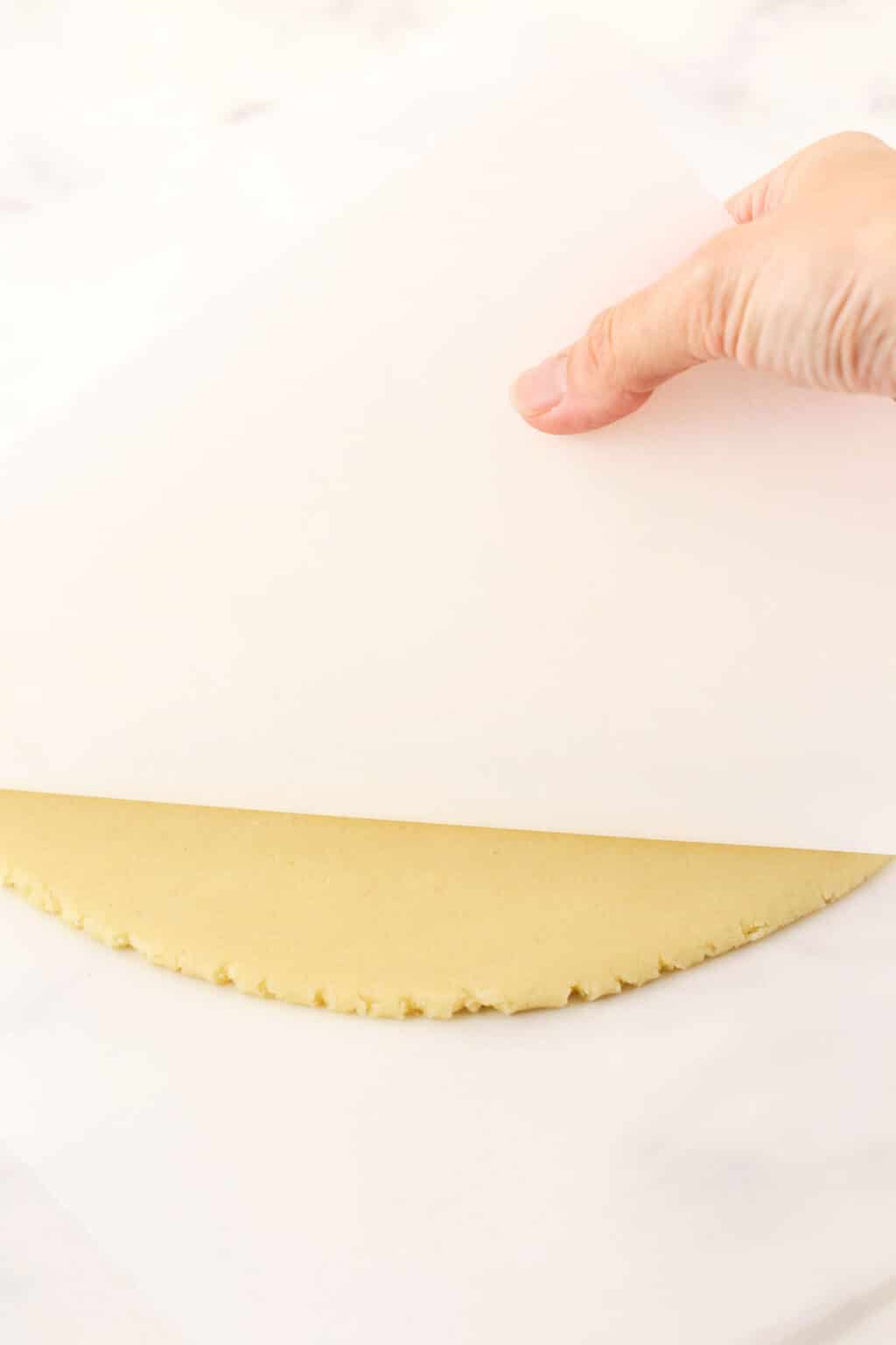 Taglio: Togliete l’impasto dal freezer, staccate lo strato superiore di carta da forno e tagliatelo subito a forma. Trasferire l’impasto modellato su una teglia.