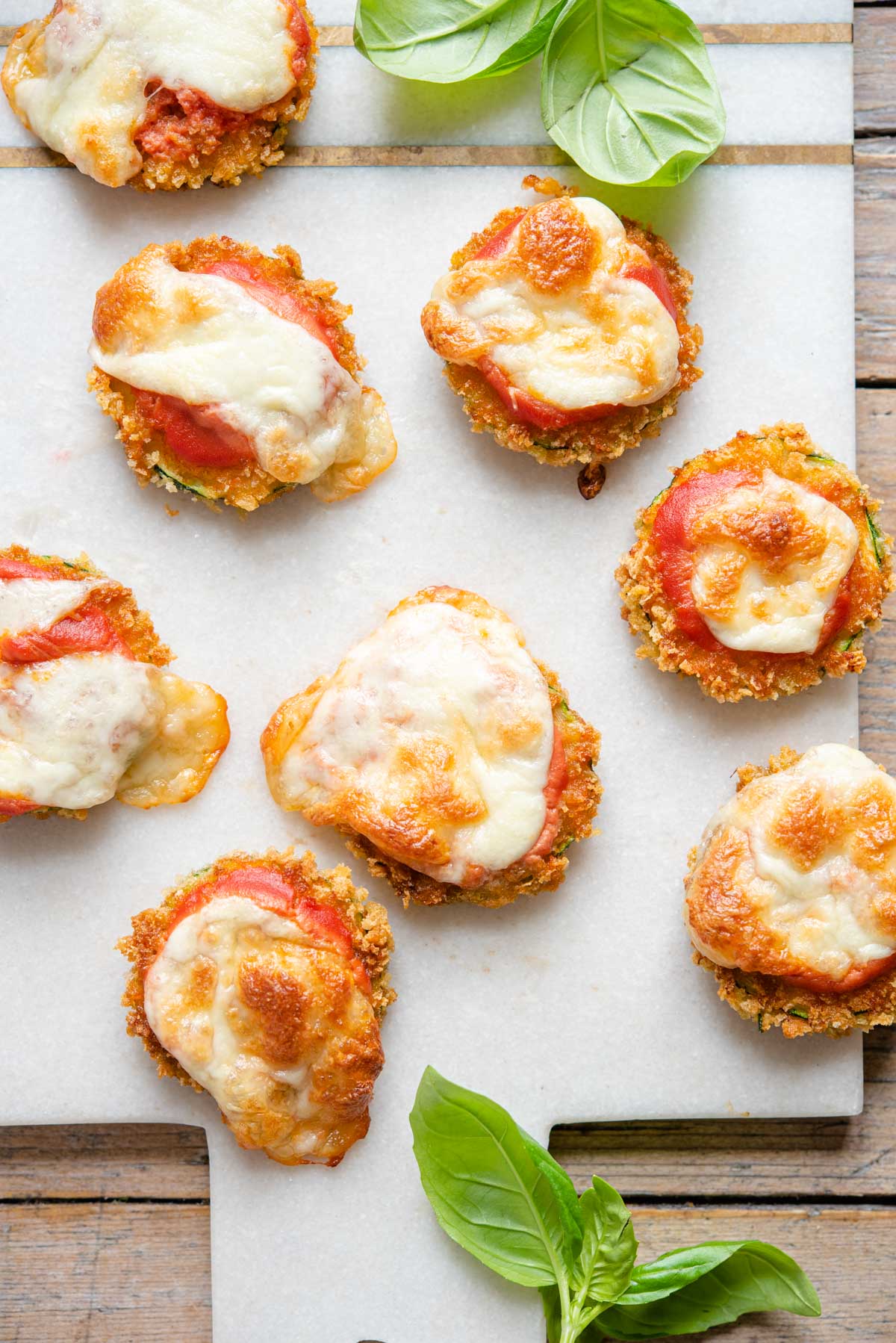 Zucchine fresche con un rivestimento croccante di pangrattato e condite con pomodoro ricco e mozzarella cremosa e fusa. Così divertente e completamente vegetariano!