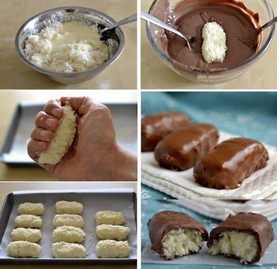 Versate in un pentolino il latte di cocco e il glucosio, mettete sul fuoco a ebollizione Nel frattempo tritate finemente il cioccolato bianco e raccoglietelo in una ciotola. Versatevi il latte bollente e mescolate. Aggiungete lo zucchero invertito, il sorbitolo e il cocco grattugiato, e amalgamate ancora. Lasciate raffreddare e nel frattempo fate sciogliere il burro di cacao; appena sarà fuso ma non bollente, unitelo al composto. Mescolate e realizzate tante striscioline lunghe e regolari. Fate riposare, fino a quando non si formerà una piccola crostini in superficie, tagliate alla misura desiderata, passate nel cioccolato la latte fuso e cospargete con il cocco grattugiato. Lasciate rapprendere e servite, a piacere, con un buon caffè.