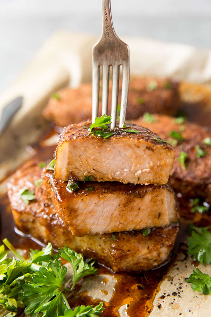Puoi usare questa ricetta per le braciole di maiale disossate o per le braciole di maiale con osso, ed è particolarmente deliziosa con le braciole di maiale tagliate spesse. Servire con un’insalata e purè di patate o se si preferisce un piatto unico, è possibile arrostire verdure e patate nella stessa padella. Di seguito troverai tutti i dettagli!
