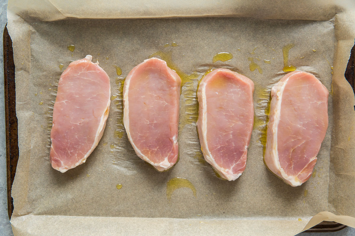 - Asciugare le braciole di maiale con carta assorbente. Ungete le braciole di maiale con l’olio d’oliva e disponetele sulla teglia preparata.