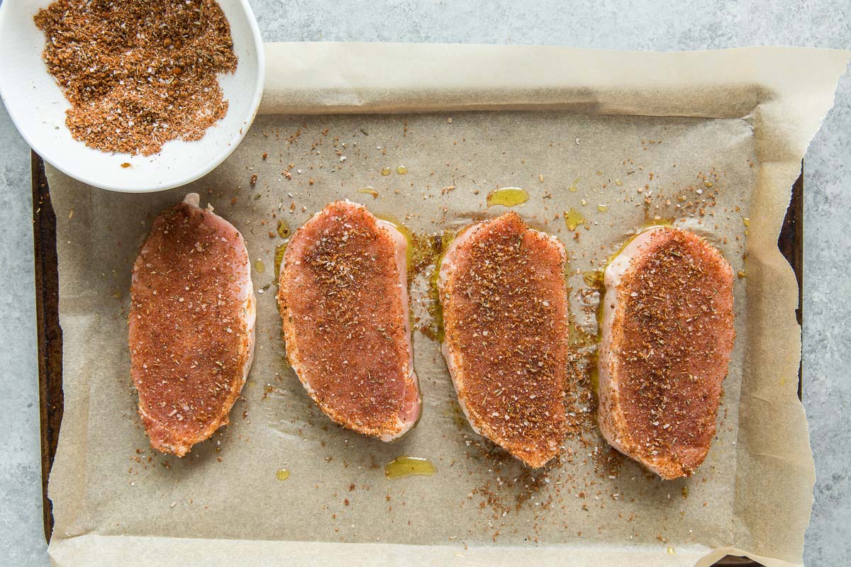 - Strofinare la miscela di spezie su tutti i lati delle braciole di maiale.