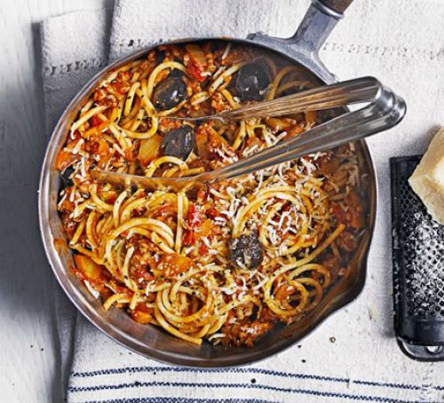 Pulite e lavate il finocchio; tagliatelo in 4 spicchi e lessatelo in acqua bollente salata per una decina di minuti. Sgocciolatelo perfettamente e spezzettatelo. Tritate finemente la cipolla e fatela appassire in un tegame con l’olio e lo spicchio d’aglio schiacciato. Prima che il soffritto prenda colore, eliminate l’aglio e unite il finocchio. Rosolate per un minuto, mescolando; poi, aggiungete i pomodori tagliuzzati e lasciate insaporire a fuoco vivo per un paio di minuti. Salate, pepate, condite con un pizzico di origano e una manciata di prezzemolo tritato e cuocete, coperto, per 20 minuti. Qualche istante prima di spegnere la fiamma, unite al sugo le olive a rondelle. Cuocete i bucatini al dente e conditeli con l’intingolo preparato.