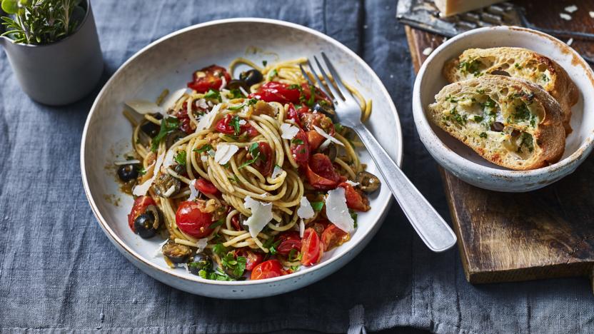 Sciacquate la melanzana e togliete il picciolo; tagliatela, quindi, a cubetti, cospargetela di sale e ponetela in un colapasta a perdere l’acqua di vegetazione. Lavate i peperoni, asciugateli e arrostiteli; poi, spellateli, eliminate semi e filamenti interni e tagliateli a striscioline. Pelate i pomodori; privateli dei semi e passateli al setaccio. Fate imbiondire l’aglio schiacciato in un tegame con l’olio; eliminatelo e aggiungete la polpa di pomodoro e la melanzana e cuocete per una decina di minuti. Trascorso questo tempo, unite i peperoni, le olive snocciolate, le acciughe, i pinoli e il prezzemolo tritato; salate moderatamente e cospargete di pepe. Coprite e proseguite la cottura, su fuoco lento, per 15 minuti, mescolando di tanto in tanto. Nel frattempo, portate a bollore l’acqua per la pasta; salate e lessate i bucatini. Scolateli al dente e conditeli con la salsa preparata. Spargetevi sopra il pecorino e servite.