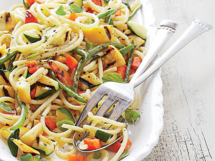Mondate e lavate tutte le verdure. Tagliate i peperoni a listarelle, la carota e le zucchine a dadini. Versate l’olio in una larga padella e unite i pinoli e un trito di cipolla, aglio e sedano e soffriggete tutto dolcemente; poi, aggiungete gli ortaggi preparati e rosolate per qualche minuto, su fiamma bassa. Versate i pomodori spezzettati e condite l’intingolo con sale e pepe; coprite e cuocete per 15 minuti. Trascorso questo tempo, mescolate le punte di asparagi spezzettate al sugo; cospargete di basilico e prezzemolo tritati e proseguite la cottura per altri 5 minuti. Lessate i bucatini in abbondante acqua salata; scolateli al dente e saltateli in tegame con il condimento preparato.