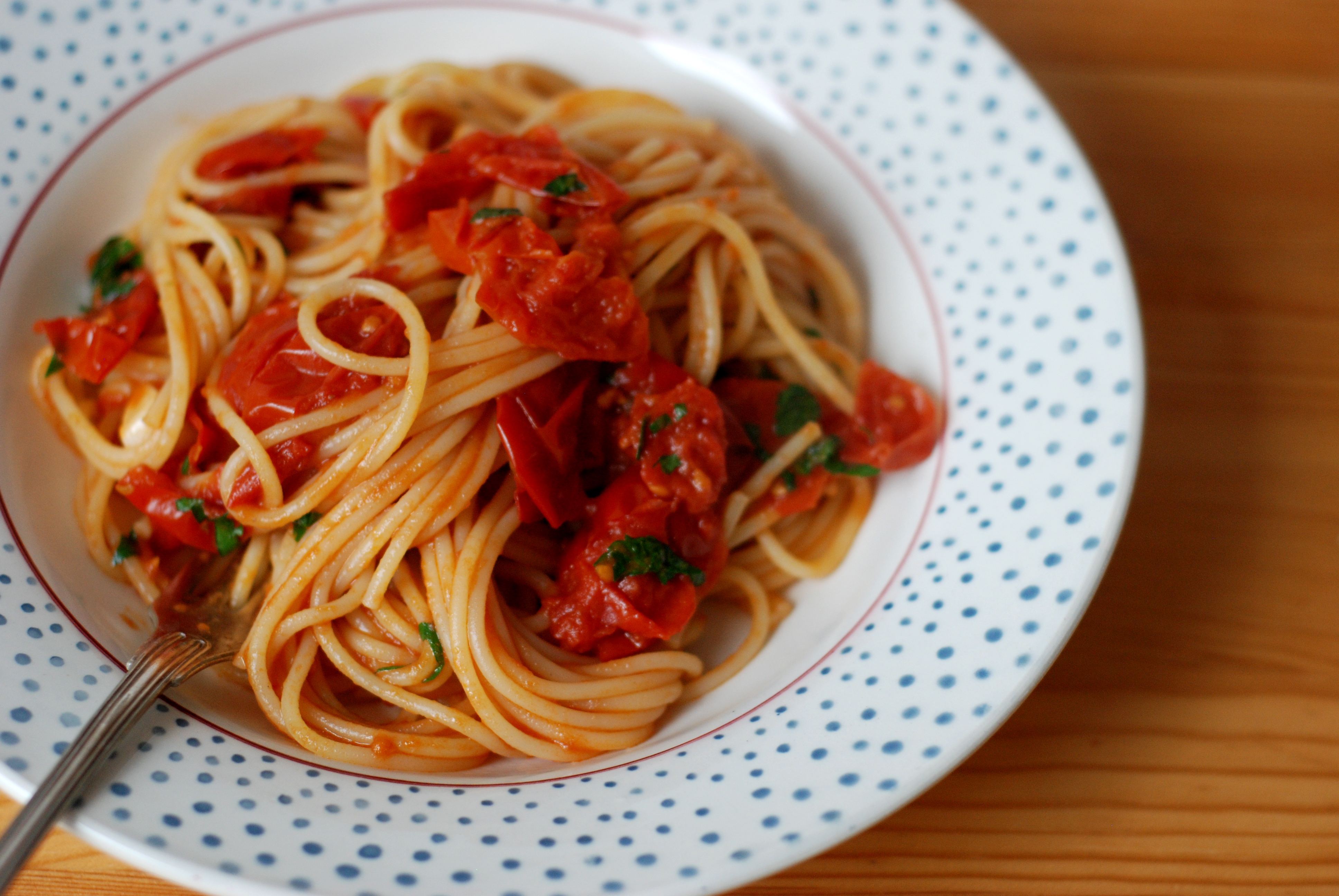 Scolate a questo punto la pasta tenendo un bicchiere di acqua di cottura e versatela nella padella con i pomodorini e le olive quindi unite un po’ di acqua di cottura e metà del pane grattugiato. Fate insaporire il tutto velocemente e prima di servire unite un’altra spolverata di pangrattato.