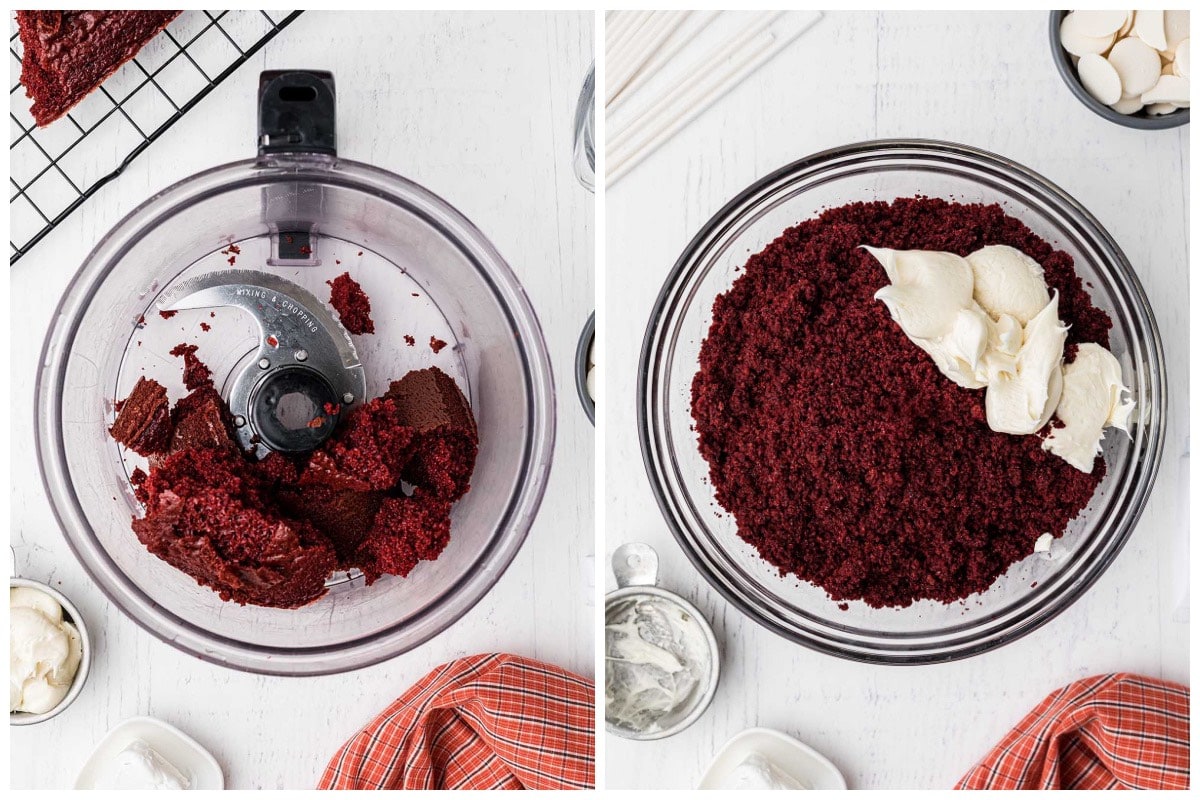- Rompi la torta raffreddata in pezzi e riducili in piccole briciole usando un robot da cucina. Unire le briciole di torta e la glassa al formaggio cremoso in una ciotola.