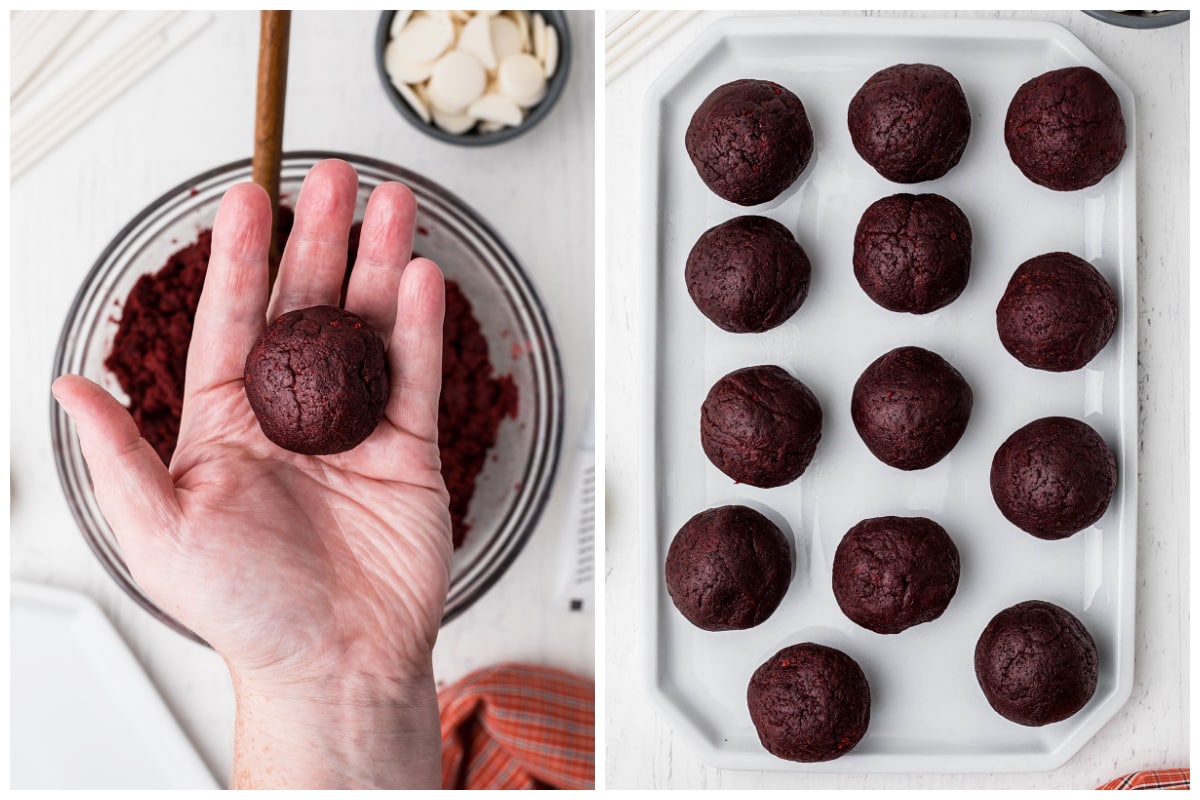 - Arrotolare l’impasto della torta in palline da 2 pollici (5,08 cm) e posizionarle su una teglia foderata di carta da forno.