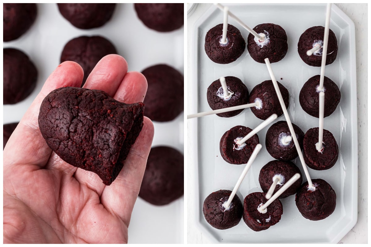 Premi l’estremità bagnata del bastoncino di cioccolato in ogni pallina, a circa 2/3 dell’interno e riponi il vassoio in frigorifero.
